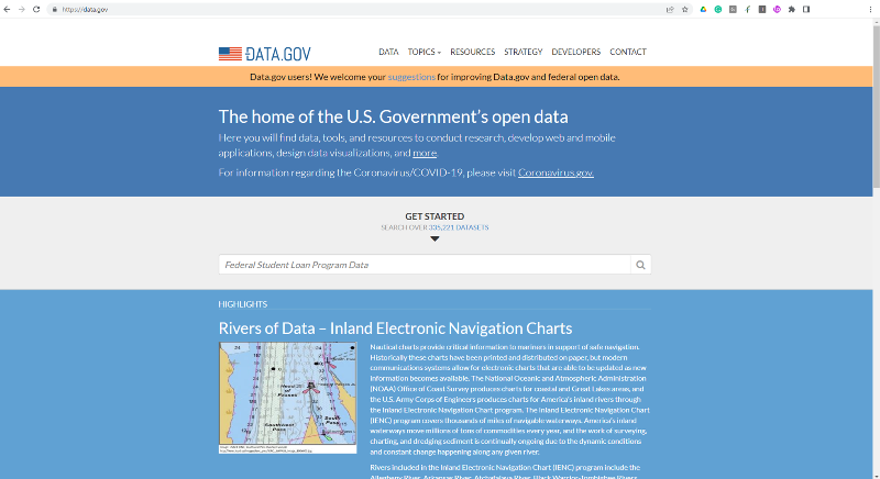 미국 정부가 제공하는 오픈데이터 소스이다. 각종 연구를 위한 데이터 자체뿐만 아니라 웹이나 모바일 어플리케이션, 시각화 등을 위한 추가 정보까지 제공하고 있다. 사실 이건 대한민국 데이터 포털도 마찬가지이긴 한다. 미국 데이터 포털에서는 335,221건의 데이터 세트를 제공하고 있다.