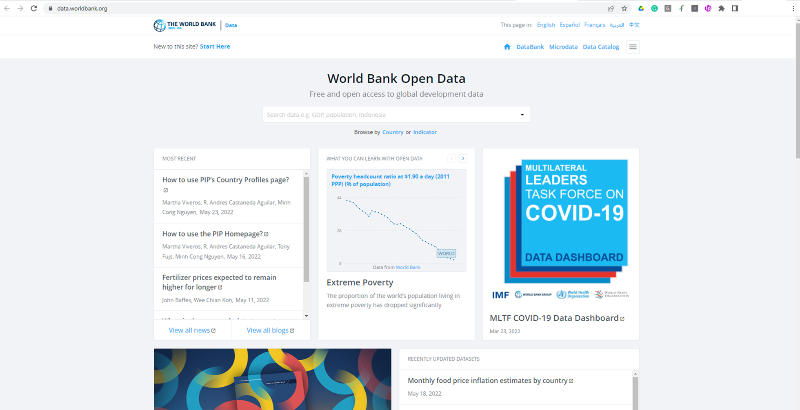 세계 주요 경제 관련 오픈데이터를 제공한다. 신문기사, 뉴스, 논문 등 다양한 매체에서 세계은행의 통계 및 조사 자료를 인용하여 발표한다. 그만큼 공신력이 있다는 말이다. 데이터들은 직접 다운로드할 수도 있고, 자체 시각화 툴을 통해서 그래프, 차트 등으로 볼 수도 있다.