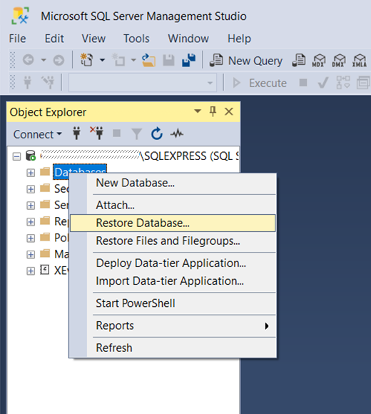 설치링크 바로 아래에 SSMS에서 어떻게 AdventureWorks 데이터베이스를 불러오는지 자세하게 나와있다. 우선 아래 그림과 같이 Object Explorer(개체 탐색기)에서, Database를 우클릭한 후, '데이터베이스 복원'을 클릭한다.