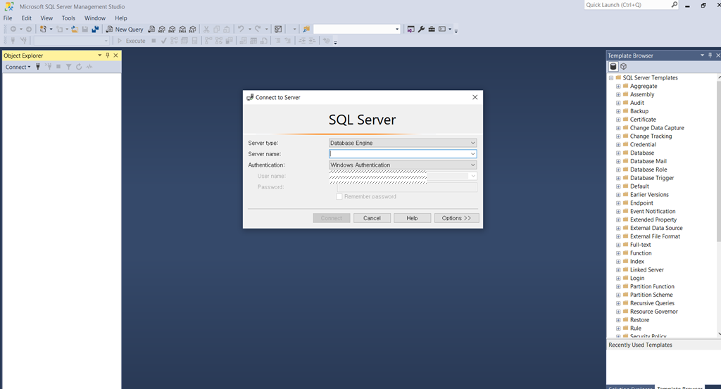 처음 SSMS을 실행시키면 아래와 같이 SQL 서버에 연결하는 창이 뜬다. 서버 이름에 아무것도 뜨지 않는 게 정상이다.
