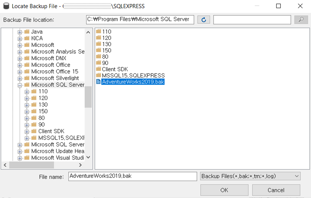 이후에 나오는 창에서 아까 다운로드한 'AdventureWorks2019.bak' 파일을 선택한다. 파일의 위치는 어디에 있든 크게 상관은 없다.