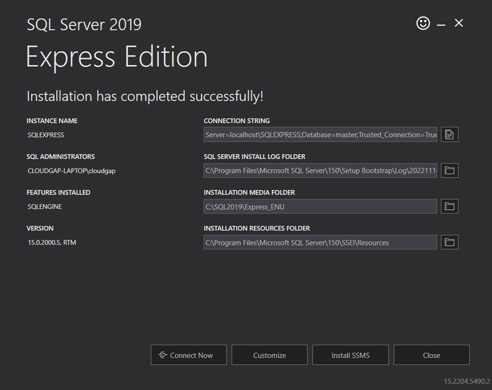 생각보다 약간 긴 시간 동안 설치가 끝나면 설치된 서버의 정보가 아래와 같이 나온다. 특별히 적거나 저장해둘 필요는 없고, 지금 바로 연결도 굳이 꼭 할 필요는 없다. 아직 Microsoft SQL Server Management Studio를 설치하지 않은 경우, 'SSMS' (SQL Server Management Studio) 설치를 클릭하여 추가로 설치한다.