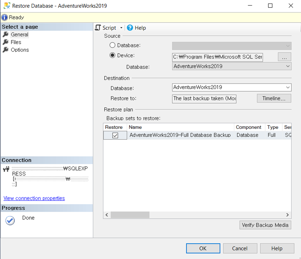 아래와 같이 데이터베이스 복원 마법사가 실행이 된다. 디바이스를 선택하고 오른쪽에 있는 '...' 버튼을 클릭한다.