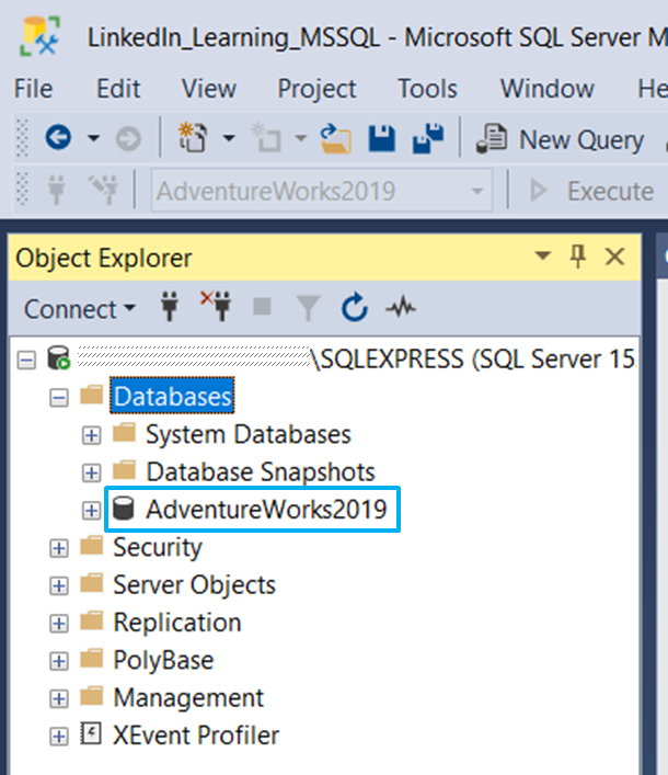 데이터베이스 복원이 잘 되었다면, 아래와 같이 Object Explorer (개체 탐색기)의 데이터베이스 항목 아래에 'AdventureWorks2019'가 아이콘과 같이 보인다.