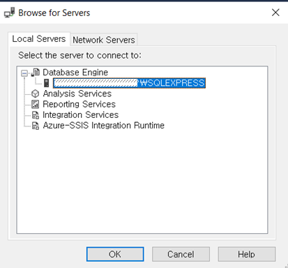 서버 이름의 오른쪽 끝을 클릭해서 펼쳐보면, 'Browse for more...' 가 나온다. 그걸 클릭하면 서버를 선택할 수 있는 창이 나오는데 보통 '(본인 컴퓨터 이름)\SQLEXPRESS'라고 써 있는 게 조금 전에 설치한 SQL Server Express이다. OK 누르고 조금 전 보였던 첫 연결 창에 가서 '연결' 또는 'Connect'를 클릭하면 서버 연결이 끝난다. 생각보다 쉽지 않은가.