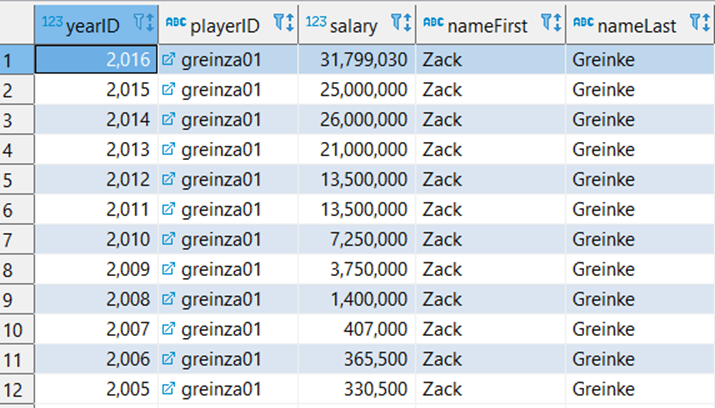잭 그레인키(Zack Greinke)의 연봉은 아래의 쿼리를 통해 확인할 수 있다.