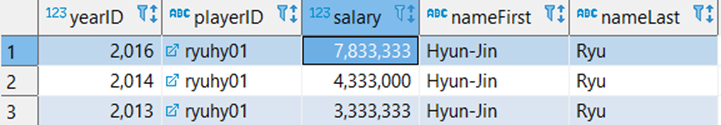 지난 포스팅에서 (SQL 처음으로 배우기 - JOIN) 클레이튼 커쇼가 2016년에 MLB 최고의 연봉을 받는 선수임을 확인했다. 2013년도에 국내 팬들에게도 잘 알려진 다저스 3인방의 연봉이 어떻게 변해왔는지 알아보자.