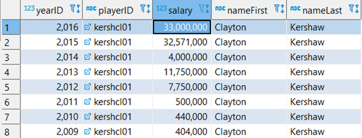 위의 쿼리에서 잭 그레인키의 Last Name (Greinke) 대신에 클레이튼 커쇼의 Last Name (Kershaw)로 바꿔 넣으면 커쇼의 연봉 변화를 볼 수 있다.