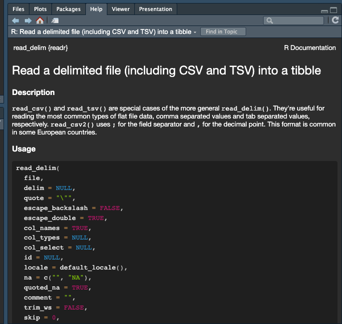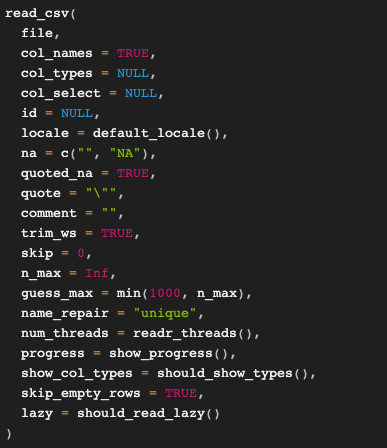 더 자세한 내용에 대해서 알고 싶다면 R Cran의 'readr' 패키지 공식문서를 확인해 보자.