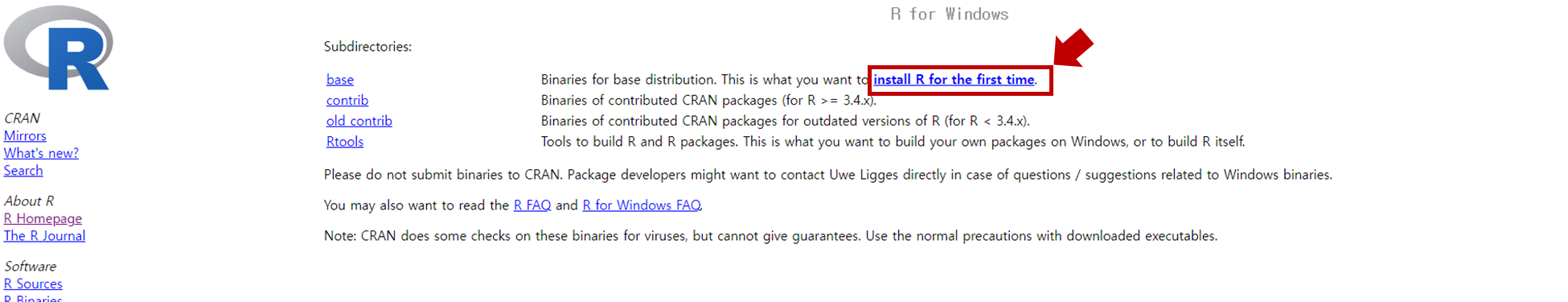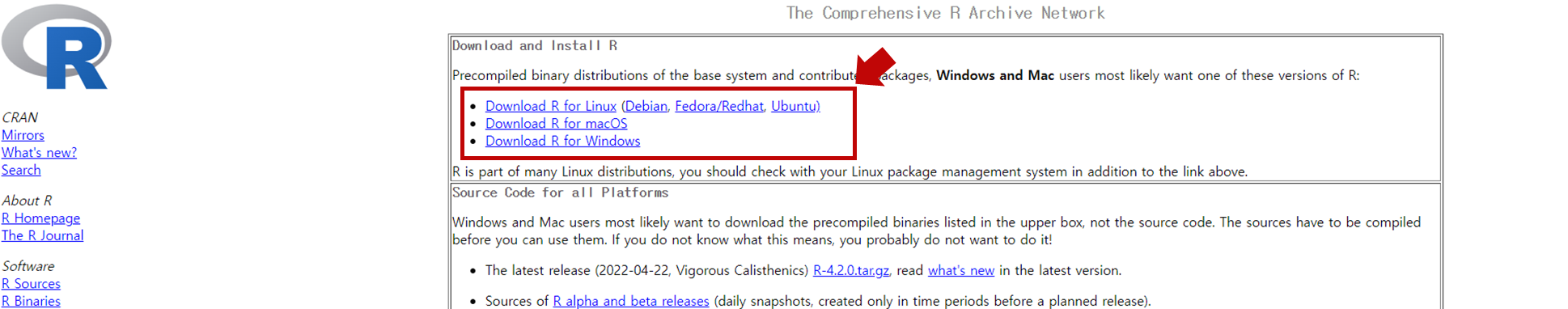 R은 오픈소스이므로 R Cran사이트(https://cran.r-project.org/)에서 맥 또는 윈도우용을 선택 다운로드한 후 설치하면 된다. R의 공식 사이트(https://www.r-project.org/)에서 'CRAN'을 선택한 후, 본인이 있는 국가의 Mirror를 선택하면 Cran 사이트가 나온다.