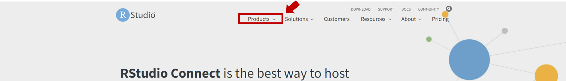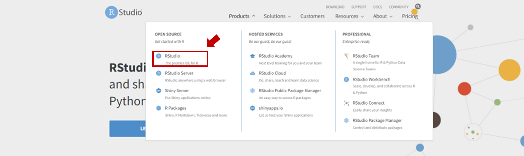 1. R Studio 공식 사이트(https://www.rstudio.com/)에서 'Product'를 선택하면 여러 제품들 중에서 'R Studio'를 선택한다.